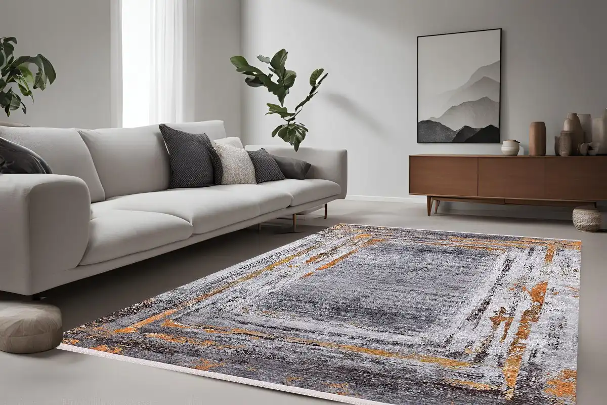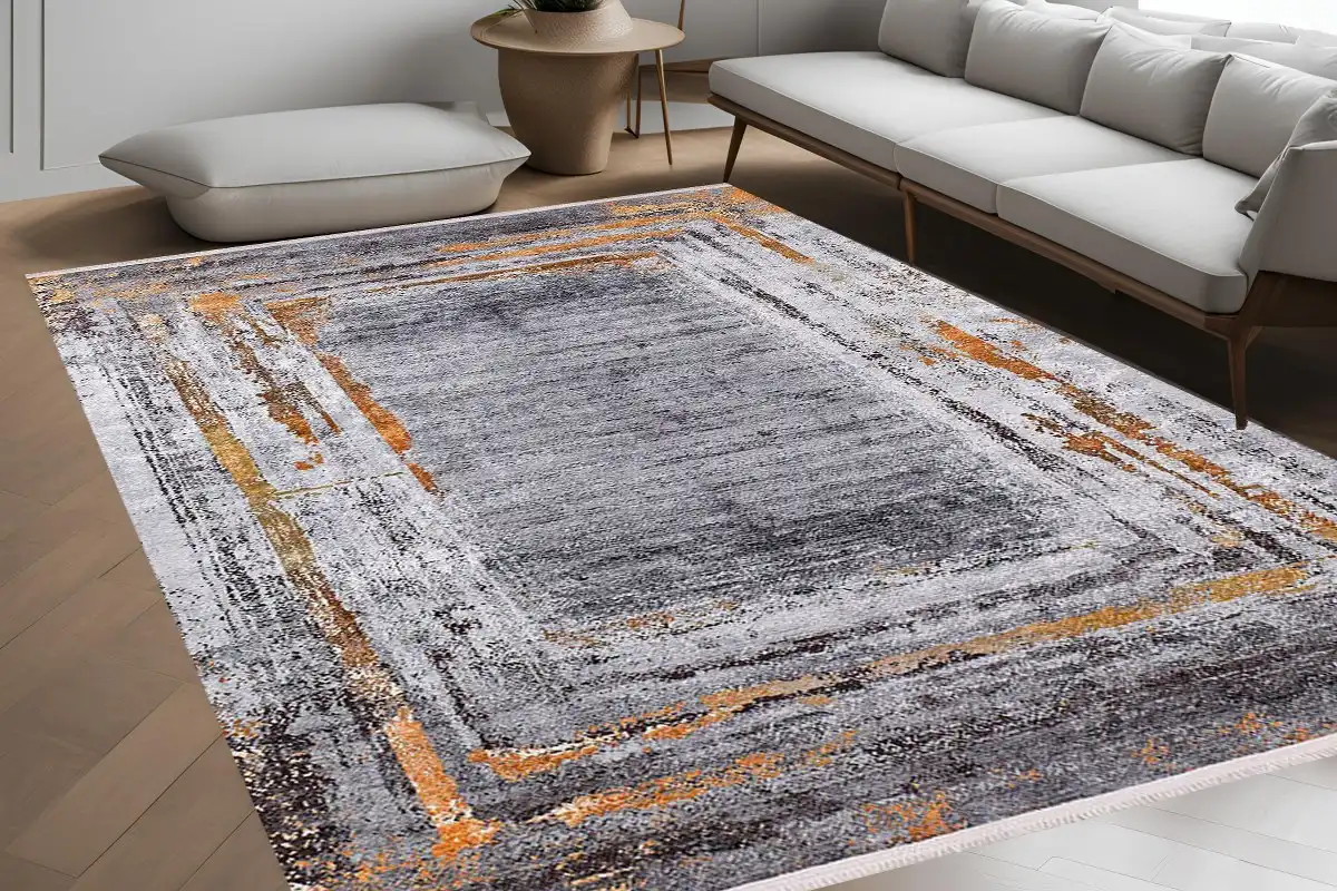 Bu halının gri ve bronz-kahverengi tonları, farklı dekorasyon tarzlarına uyum sağlayan sofistike ve çok yönlü bir zemin oluşturur.